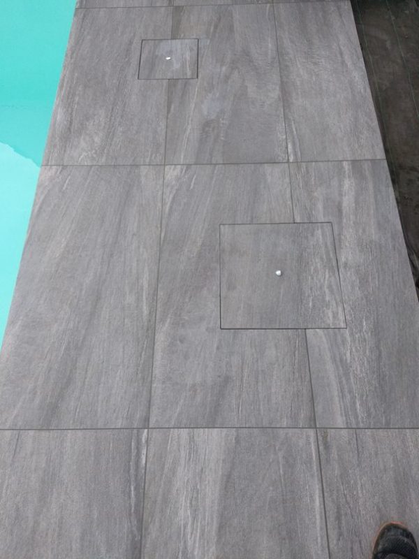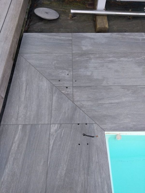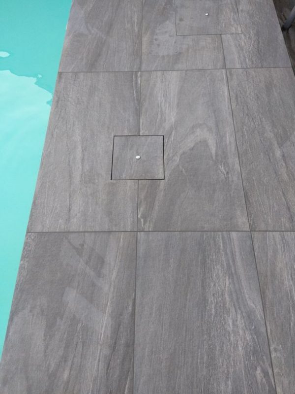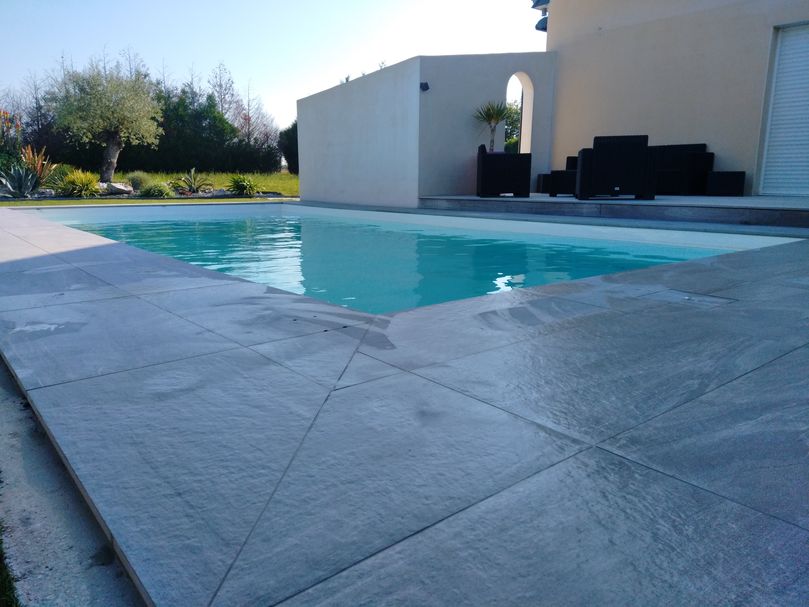 Pose de carrelage par notre équipe autour d’une piscine pour le plus grand bonheur de nos clients qui pourront profiter de leur extérieur comme il se doit.