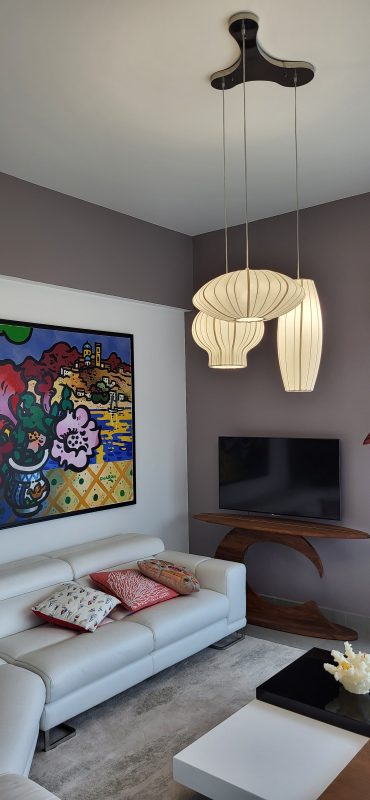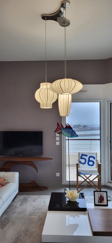 Les abat-jour de cette suspension avaient bien besoin d’être refaits car le tissu en polyester et elastanne était complètement distendu. Les clients ont choisi un joli satin de coton de chez Casamance qui a été tendu et entièrement cousu à la main selon la méthode traditionnelle.