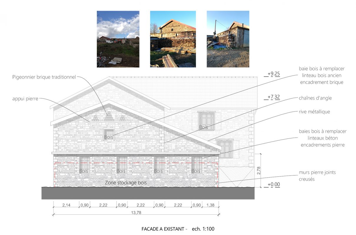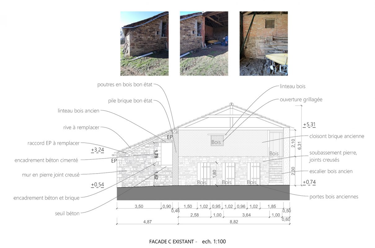 Il s’agit de la partie agricole d’un hameau. Ce relevé a permit de noter les éléments essentiels à la compréhension de l’état des bâtiments en 2023. Ces différents bâtiments sont majoritairement en pierre avec des diverses couvertures. Des parties ont été construites en parpaings et sont plus récentes que les parties en pierre.