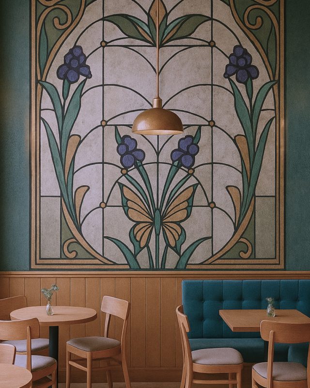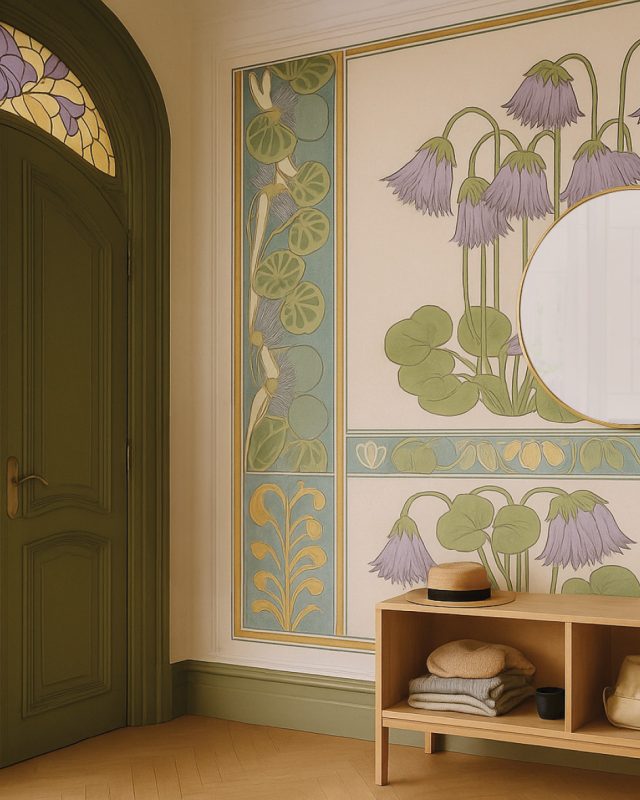 Une esthétique élégante et poétique, aux palettes de verts sauge, ors patinés et bleus profonds, portée par des artistes comme Mucha, Guimard ou Grasset.