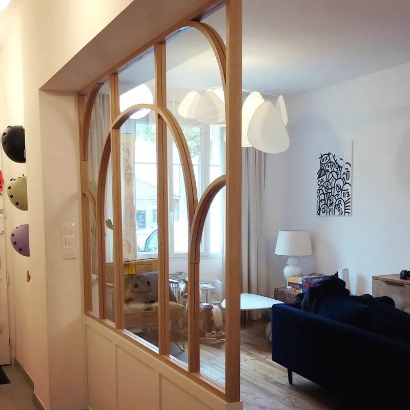 Cette magnifique verrière en chêne massif reprend des motifs art déco pour s’intégrer avec légèreté dans l’intérieur de cette maison nantaise.